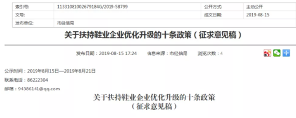 08月19日讯,为鼓励和扶持鞋业企业做大做强,引领和带动产业提档升级,着力提升温岭鞋业核心竞争力,在振兴实体经济、科技创新等政策的基础上,8月15日,温岭发布《关于扶持鞋业企业优化升级的十条政策》(征求意见稿)!