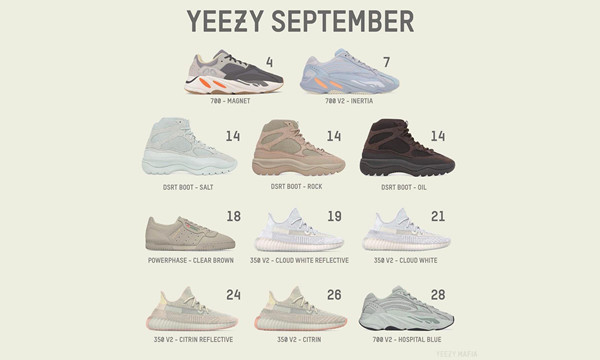 08月31日讯,上周为大家曝光 9 月 YEEZY 发售鞋款预览后,不少朋友肯定早就按照各自的目标准备好了充足预算,不过根据当时的图片来看,选什么还有点模糊,毕竟有可能和实物有些差距。今天 Yeezy Mafia 再度给出进一步参考,在原有基础上呈现了每一款的实物照,应该和最终差别不大;此外还有一个小变化:9 月 28 日发售的将是 Yeezy Boost 700 V2 “Hospital Blue”,而非此前的 Yeezy Boost 700,其余部分则保持一致。这次进一步参考后,入手什么应该很清晰了吧?