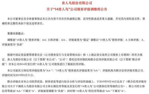 关于此次评级下调,贵人鸟披露的公告称,联合评级在对公司经营状况、财务状况等进行综合分析与评估的基础上,于2019年9月16日出具公告,将其主体信用等级由“AA-”下调至“A”,评级展望调整为“负面”;同时将“14贵人鸟”的信用等级由“AA-”下调至“A”。