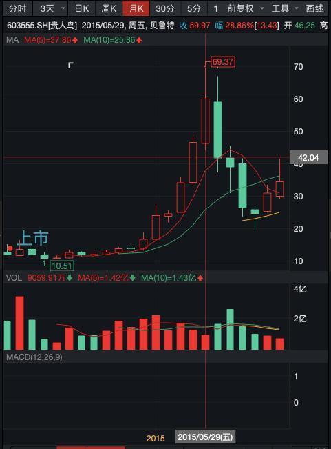 2015年A股迎来一轮大牛市,贵人鸟的股价也一路飙升,最高时达到69.37元,市值一度突破400亿元。即使后来随大市下跌,但在股价平稳后市值也维持在150亿左右,盖过当时发展趋于成熟的李宁。