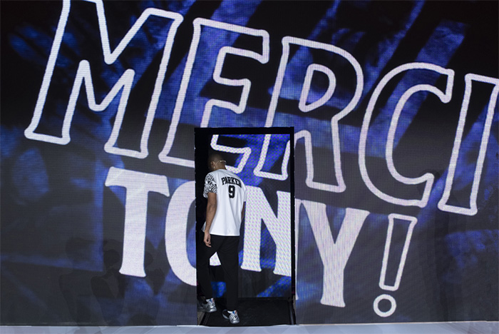 第二,沉浸式体验设计。在这次退役仪式现场,外场有很巧妙的帕克经典时刻的挂幅,展出来像看艺术品;外场和内场有时光隧道,记录着帕克的成绩和荣誉;背景声来自赛场内外,观者如同进到了NBA赛场……