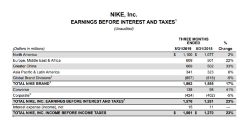 耐克在财报中表示,2020财年第一季度利润的增长主要是由于“强劲的营收增长和毛利率上升”。其中,耐克大中华区2020财年第一季度营收达16.79亿美元,在汇率不变的基础上,同比增长27%,连续21个季度实现双位数增长;息税前利润同比增长33%,达到6.69亿美元。