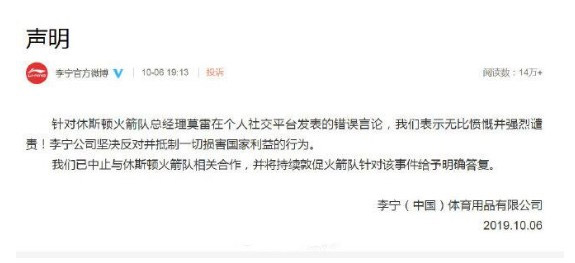 李宁、腾讯体育相继发表声明:中止与休斯顿火箭队合作、暂停火箭队比赛直播