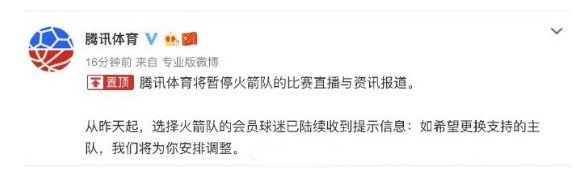 腾讯体育也发表相关声明称,腾讯体育将暂停火箭队的比赛直播与资讯报道。从昨天起,选择火箭队的会员球迷已陆续收到提示信息:如希望更换支持的主队,我们将为你安排调整。