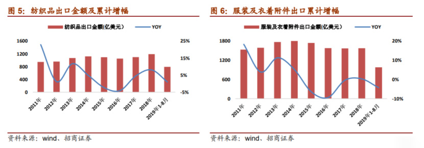 一方面,外贸环境恶化,我国纺织品及服装出口持续下滑所致。受中美贸易摩擦影响,2019年1-8月我国纺织品及服装出口金额同比下降2.49%至1774亿美元。其中,纺织品累计出口金额同比上升1%至794亿美元;服装及附件累计出口金额同比下降4.3%至980亿美元,继续呈现纺织品出口偏强,服装出口较弱的分化态势。