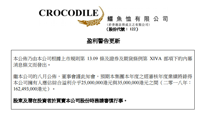 鳄鱼恤盈警 全年净利润同比下降约78.5%至84.6%