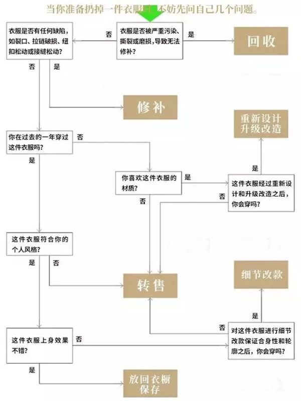 服装业可持续发展的动力来源于消费者和企业之间的共同责任。虽然各路设计师、艺术家、品牌都在积极地消除废弃物,但要彻底杜绝时尚垃圾,还需要消费者思想的转变。消费者能够选择购买更具可持续性的服装,丢弃服装时合理回收,那实现“循环时尚经济”社会将变得不再遥远。当你丢弃旧衣服时,请善待每一件“老相好”。以下逻辑图表,可以帮助你判断一件衣服是否真的应该被回收处理。