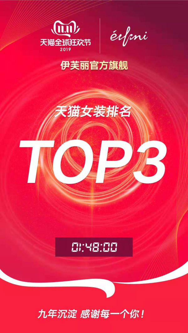 伊芙丽全品牌1点09破2亿  提前去年7小时,目前女装top3!