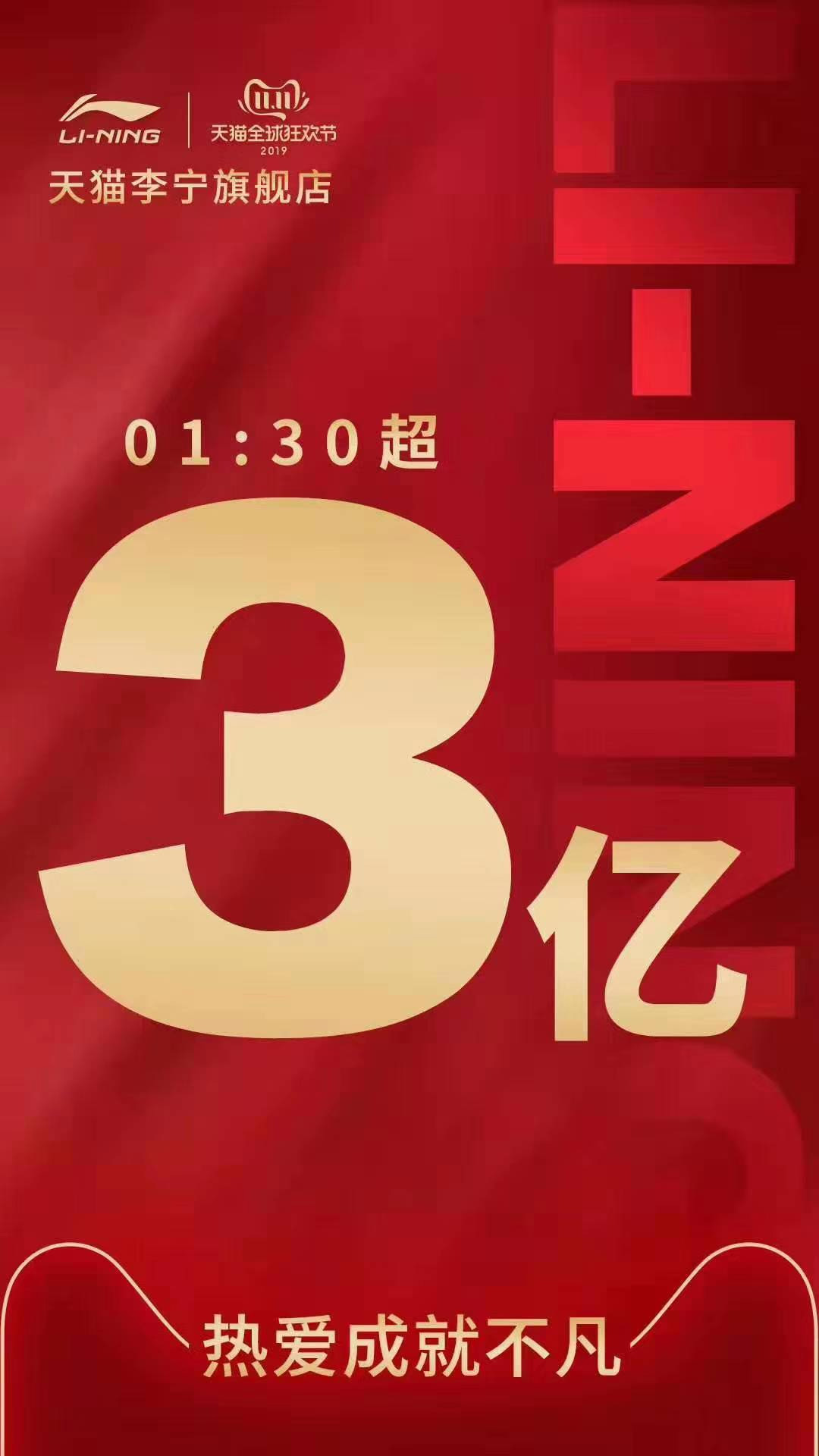 双十一开场1小时30分 李宁天猫旗舰店销售额破3亿