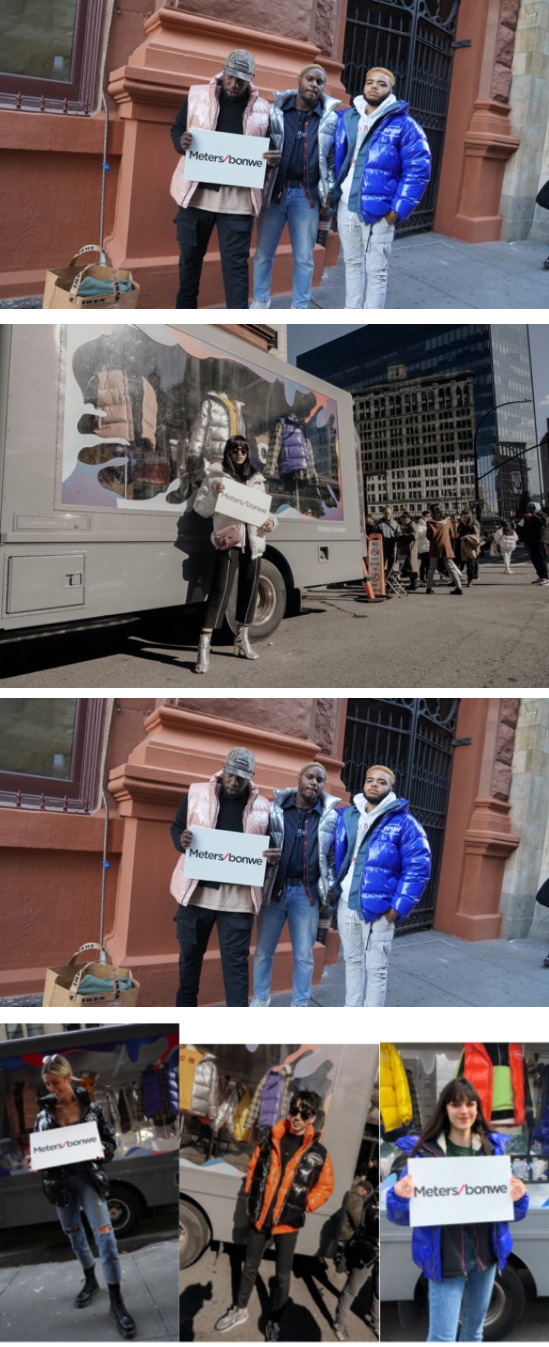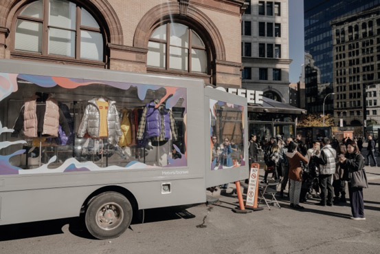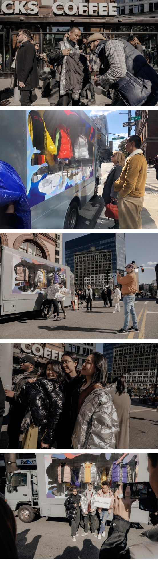 这家“嗖”的一声会跑的快闪店在冬日的纽约街头显得如此多彩亮眼,很快就吸引了纽约街头所有人的目光。活动现场人气爆棚,大家纷纷上前试穿美特斯邦威的羽绒服、互动拍照,一时之间成为了街头人们议论纷纷的话题。