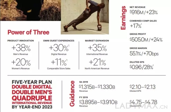报告期内,男装、电商业务和国际市场的销售额成为促进lululemon业绩增长的主要动力,其中男装第三季度销售额大涨38%,核心的女装业务销售额则大涨20%,电商渠道销售额大涨30%,来自国际市场的收入大涨35%,品牌在北美本土市场的销售额则大涨21%。