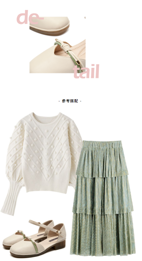 泡泡袖款钩花球球装饰的白色毛衣+极富春天色彩的蛋糕小裙子,甜美时尚,脚上的小圆头中空鞋,在细节上加分。