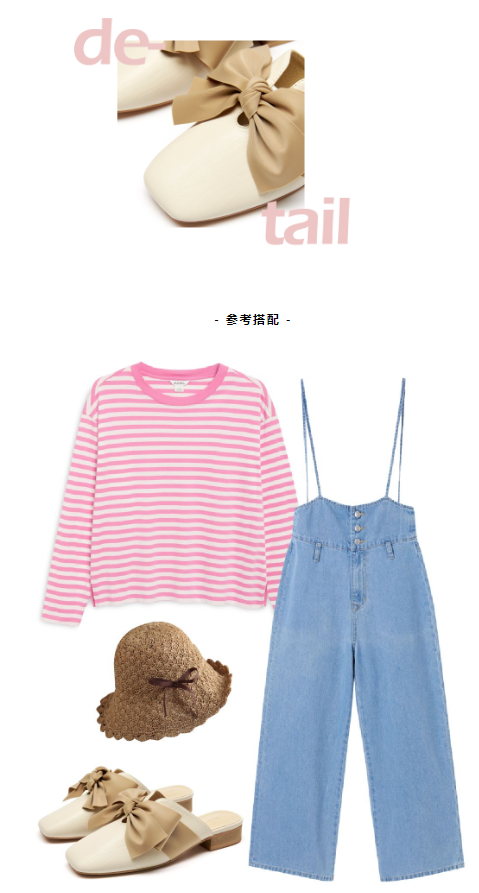 粉色的条纹T搭配上细吊带的单宁牛仔裤,复古休闲,而大蝴蝶结穆勒拖赋予了少女感,戴上编织草帽就是完美的假日穿搭!