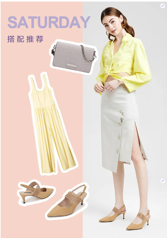 古金黄色凉鞋搭配半裙、黄色小衬衫,