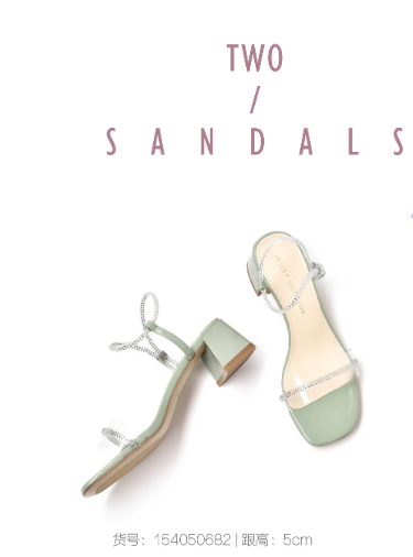 浅薄荷色粗跟凉鞋,经典条带结构,水钻点缀,让你拥有清凉的同时更加闪亮。