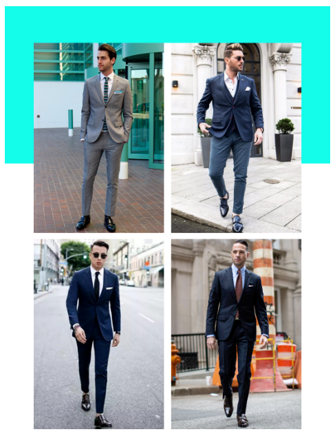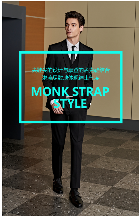 以双扣式的黑色孟克鞋,搭配各式西装裤,