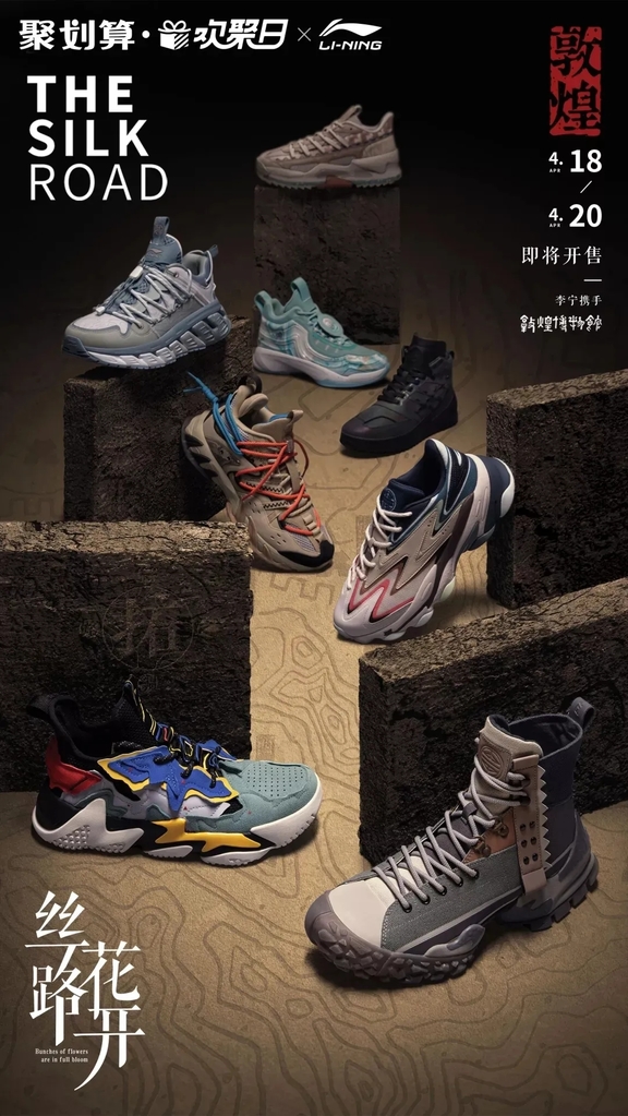 这不是李宁品牌今年到目前为止推出的唯一联名,继去年联名故宫文创后,今年李宁又联名敦煌博物馆,推出了一系列产品,每一个款式都有一个专属名称,“千行策”“沁边台”等等,让人联想到了丝绸之路。