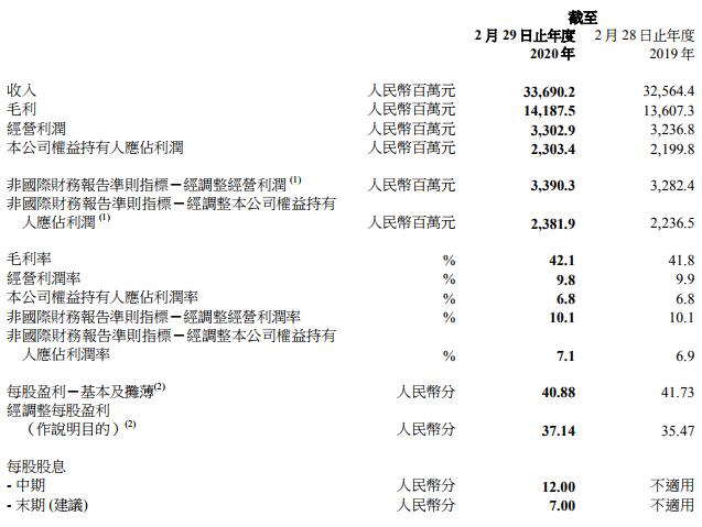 中服网消息,5月25日,滔搏国际控股有限公司(简称:滔搏)发布2020财年业绩报告,截至截至2020年2月29日的年度,本集团的收入为人民币336.90亿元,对比上年增长3.5%;本集团的经营利润为人民币33.03亿元,对比上年增长2.0%;本公司权益持有人于回顾年度应占利润为人民币23.03亿元,较上年增长4.7%。