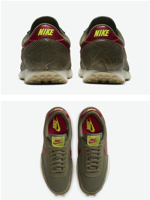美乐淘潮牌汇获悉,这双 Daybreak 整体由墨绿色帆布制作,而在鞋履的头部及尾部分别使用了蛇纹元素点缀,另外酒红色 Swoosh logo 与鞋舌、内衬等处的酒红细节尤为吸睛。