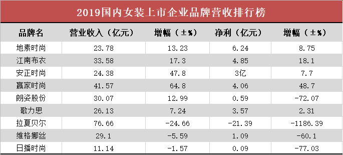 其次是净利润,除了拉夏贝尔的滑铁卢式暴跌,以及朗姿、维格娜丝和日播时尚,其它五家女装品牌净利润实现上涨,且涨幅在2%至50%之间。其中,赢家时尚飙涨48.7%至4.06亿元,江南布衣增长18.1%至4.85亿,地素时尚、安正时尚和歌力思涨幅在10%以内,基本稳中有进。