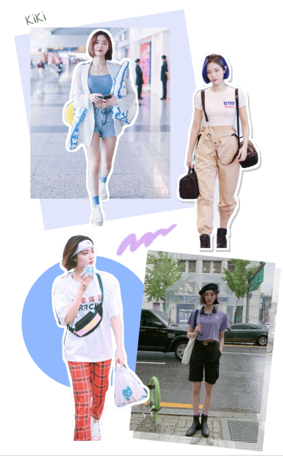 许佳琪可盐可甜的穿搭风格中,短T+长裤的出镜率很高,她常会利用发带、贝雷帽、发夹等小配件的装饰,与服装色彩、款式呼应,增添一些又甜又酷的少女感。