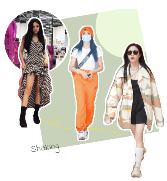 在她的穿搭里,有许多基础款的上衣和裤子,但她会选择搭配荧光色,或是搭配个性迷彩,在细节设计上展现潮酷感的个人风格。