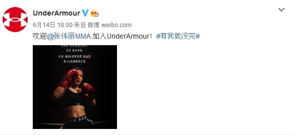 6月14日,运动品牌(UnderArmour)宣布青年演员韩东君,UFC草量级世界冠军、昆仑绝草量级、蝇量级双级别冠军张伟丽加入安德玛,成为安德玛代言大家族的一员。