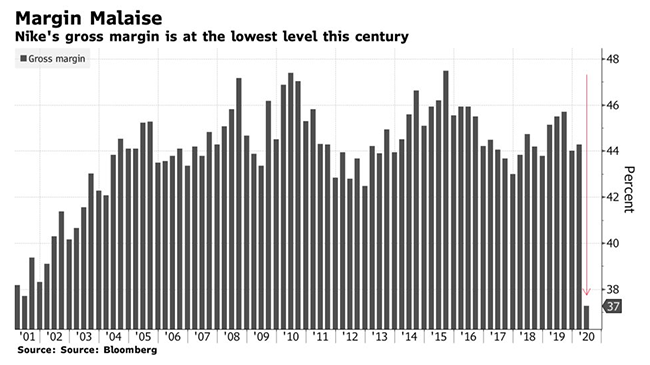 然而短时间内的电商爆发也不能弥补门店关闭、订货取消和供应链中断的顽疾。这样的结果让市场感到担忧。疫情以来,美国服装行业受到的冲击比其他零售业更为严重,4月和5月的总体营收分别下降了87%和63%。而耐克本应有所作为,对数据的降低起到更加积极的作用。