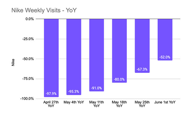 北美地区也在逐步恢复活力。根据门店客流量测算公司Placer.ai提供的数据,今年4月耐克美国门店总体客流量一度下降97.9%,不过Placer.ai营销副总裁伊森·切诺夫斯基(Ethan Chernofsky)表示,6月8日当周,客流量已恢复到仅比去年同期下降40%的水平,这还是几个关键州——纽约、新泽西和加州门店仍然关闭的结果。