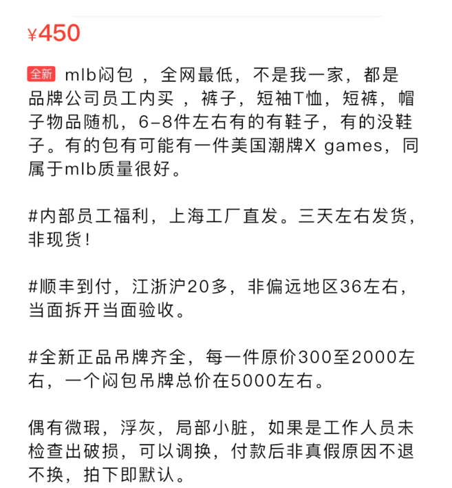 һλרÃÅÔÚÏÐÓã³öÊÛ²ð°üÉÌÆ·µÄÂô¼Ò¸æËßÀÁÐÜÌåÓý£¬Ëý»¨ÁË1400ÔªÂòµ½Ò»¸ö¡°4Ь9·þ¡±µÄÄÍ¿ËÔ±¹¤Ãưü£¬¼Û¸ñÊÇÔ¼ÛµÄ4±¶ÒÔÉÏ¡£ÔÚÔËÆø²îµÄʱºò£¬Ëý¿ªµ½¹ýÒ»ÏäB±êЬ¡£µ«Èç¹ûÔËÆøºÃ£¬Ò»¸ö°üµÄ¶«Î÷ÄÜÂô3500ÔªÒÔÉÏ¡£ÕâλÂô¼ÒÌáµ½£º¡°ÎÒ֮ǰ¿ª³öÀ´Ò»¸öÈý·½ÁªÃûºÍÒ»¸öCLOTÁªÃû£¬ËäÈ»ÔÚÊÐÃæÉϲ»Ì«ºÃÂô£¬µ«ÊÇÒ²ÄÜÒÔÒ»¸ö²»µÍµÄ¼Û¸ñÂô³öÈ¥£»Ò»ÏäÃÆ°üÀïÓÐ4˫Ь£¬ÔõôҲÄÜÂô¸ö1000ÔªÉÏÏ£¬Ê£ÏµÄ9¼þÒ·þÂô²»³öÈ¥¾Í10ÔªÒ»¼þ˦Âô£¬¿÷²»ÁË¡£¡±