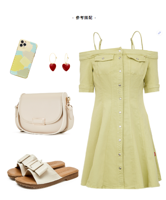 吊带一字领牛油果绿牛仔连衣裙,高腰修身设计,A字裙摆,搭配上奶白宽面拖鞋,全方面打造,迷人小腰精!