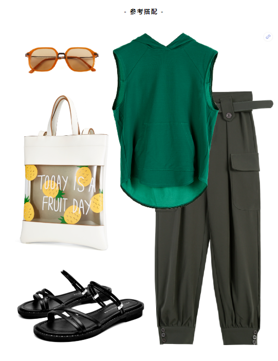 森系绿连帽无袖T,搭配宽松廓形束脚裤,飒爽舒适还显瘦,踩上一双基础款凉鞋,随性的酷感女孩儿就是你啦~