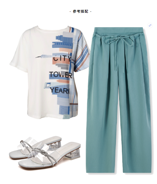 微蝙蝠袖印花白T,休闲知性,蓝绿阔腿长裤,藏肉吸睛,搭配PVC钻饰银灰方跟凉拖,提升造型时尚度。