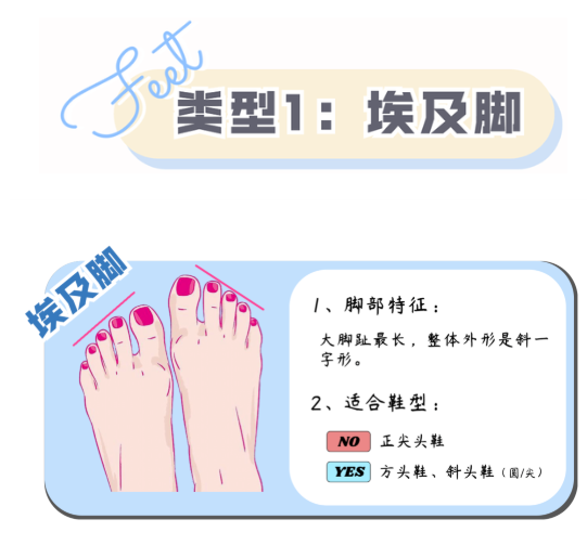 这种脚型在亚洲人中最为普遍,埃及脚在鞋款上有较大的选择空间,大部分鞋款上脚都很有美感,但也有要特别注意的鞋款哟!!!