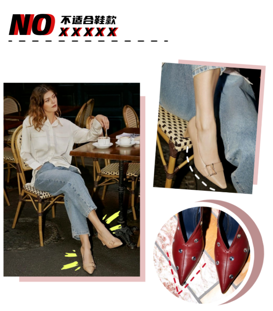 瘦长脚的妹子,一定要注意鞋面少于1/3的浅口鞋款,无论是尖头还是圆头,都难免会露出脚缝,穿得再怎么美美哒,还是会让人有丢丢尴尬。