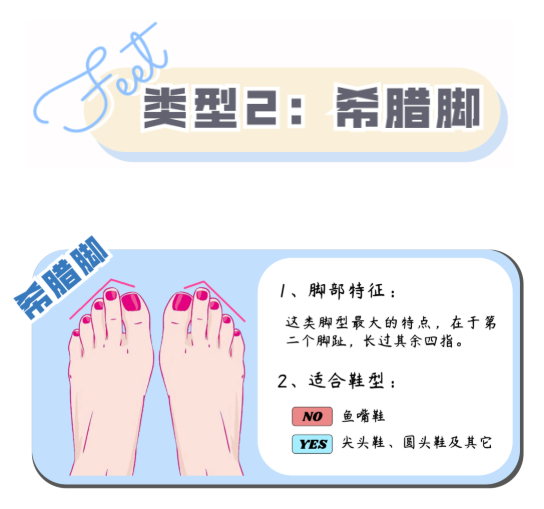 希腊脚,是传说中的女神脚哟,希腊女神雕塑大多是这种脚型。希腊脚的集美们,大多是纤细又骨感的脚型,鞋款选择空间大,特别适合一款鞋,穿上能秒变女神!
