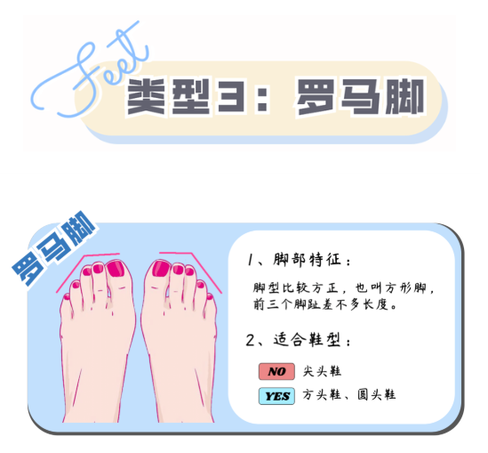 马脚前三根脚趾长度相差无几,最不适合鞋头较窄的设计鞋款。比如尖头鞋、鱼嘴鞋,这类鞋会给罗马脚的脚趾带来压迫感,走起路来极不舒适。