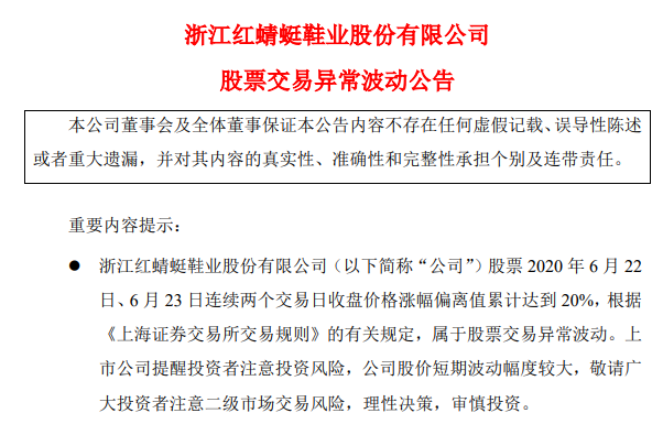 6月24日,浙江红蜻蜓鞋业股份有限公司发布公告称:公司的主营业务是红蜻蜓商务时尚皮鞋的生产与销售,目前未涉及直播带货的商业模式,现仅为公司店员在天猫旗舰店的直播以及实际控制人所进行的直播带货,公司直播带货的销售额为190万,占公司2019年销售收入的比例小于1%,占比极小,净利润为-90万,未实现盈利。目前公司直播带货不会对公司的经营业绩产生重大影响,敬请广大投资者注意投资风险。