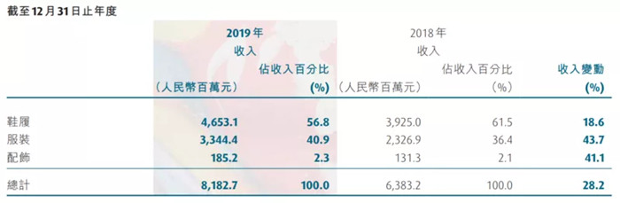 根据财报,2019年内,鞋履品类的销售额仍然占据最大份额,虽然和2018年的61.5%相比下降了4.7个百分点,但鞋履已经达到特步全年销售额的56.8%。