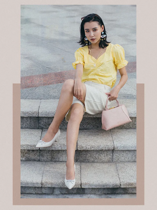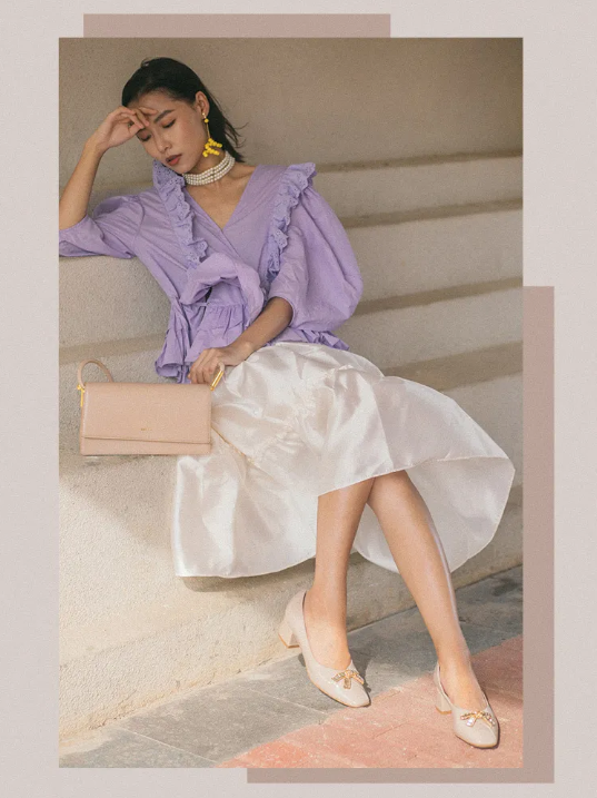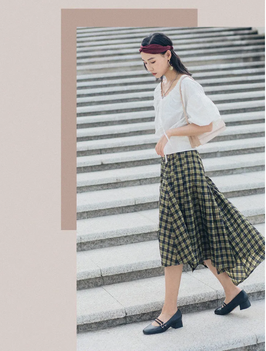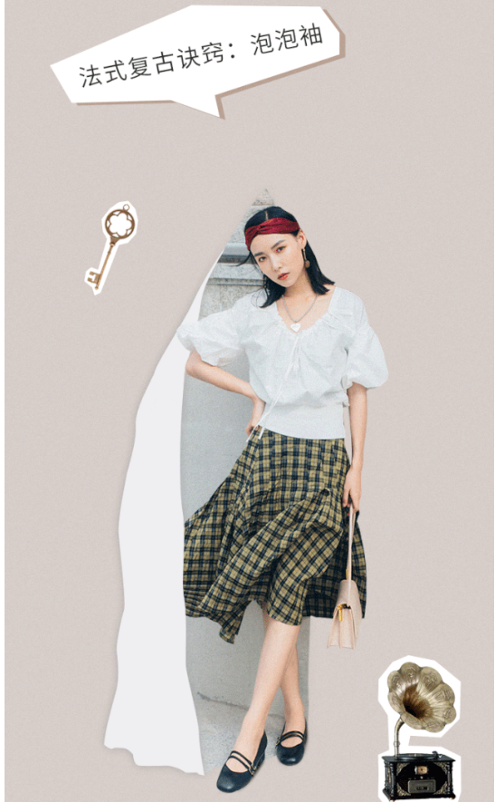 蓬松华丽的泡泡袖单衣配合淡雅格文裙