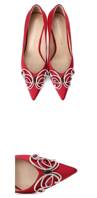 将娇贵的真丝与优雅的蝴蝶钻扣结合,展现 ROBERTA DI CAMERINO惯有的精致华美。版型设计一丝不苟,蝴蝶翅膀以颗颗闪钻勾勒,水滴形大宝石点缀两翼随足而动,捕捉光影,铺陈女性浪漫之美。
