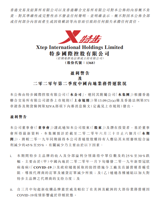 特步预计上半年净利润同比减少约45%-55%