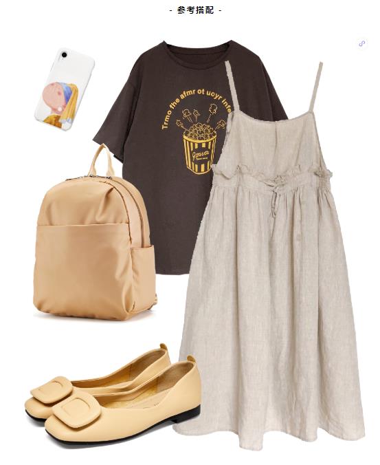 棕色童趣大T恤,外搭一条浅亚麻色吊带裙,腰部褶皱抽绳设计,外加荷叶边点缀,甜美又不失可爱,再搭配上一双浅口单鞋,日式萌系穿搭就完成了!
