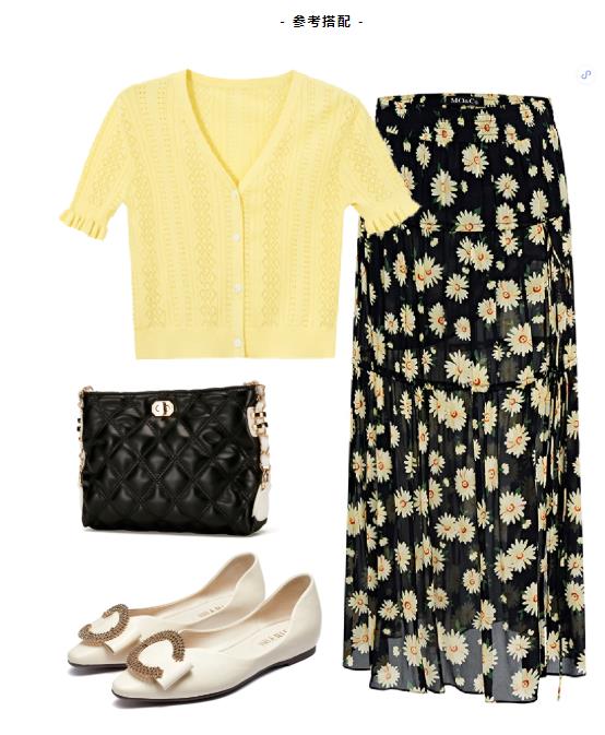 嫩黄针织开衫+开衩雏菊半身裙,将南法的文艺浪漫融入其中,塔裙样式裙摆,每一层都加入抽绳,穿出多种效果,一双尖头单鞋的加入,更添女性魅力。