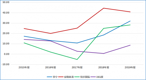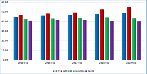 国内4家体育服饰品牌上市公司销售毛利率统计