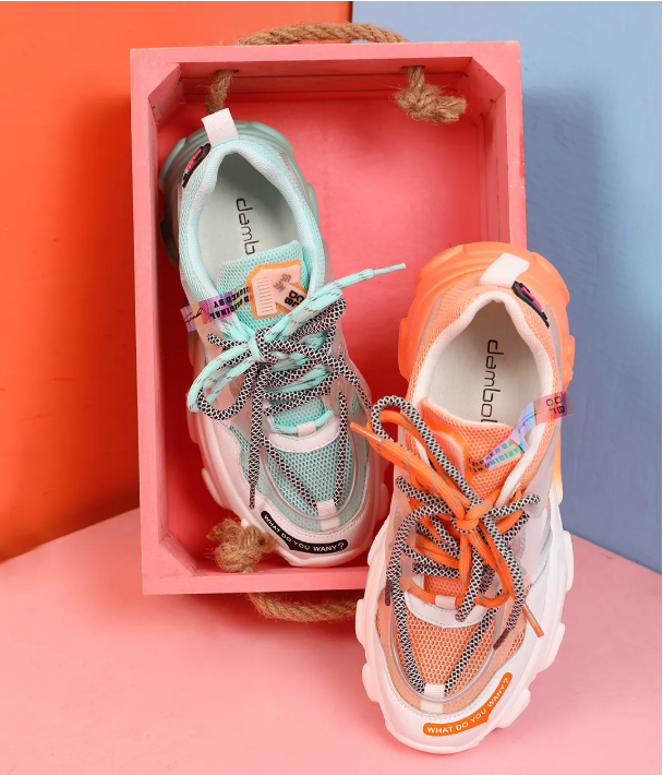 潮流老爹鞋款式,治愈系拼色设计,薄荷绿和果肉橙清新又自然,加上透明果冻质感的点缀就很简洁美!无敌不挑人,随便搭一搭就可以出门。