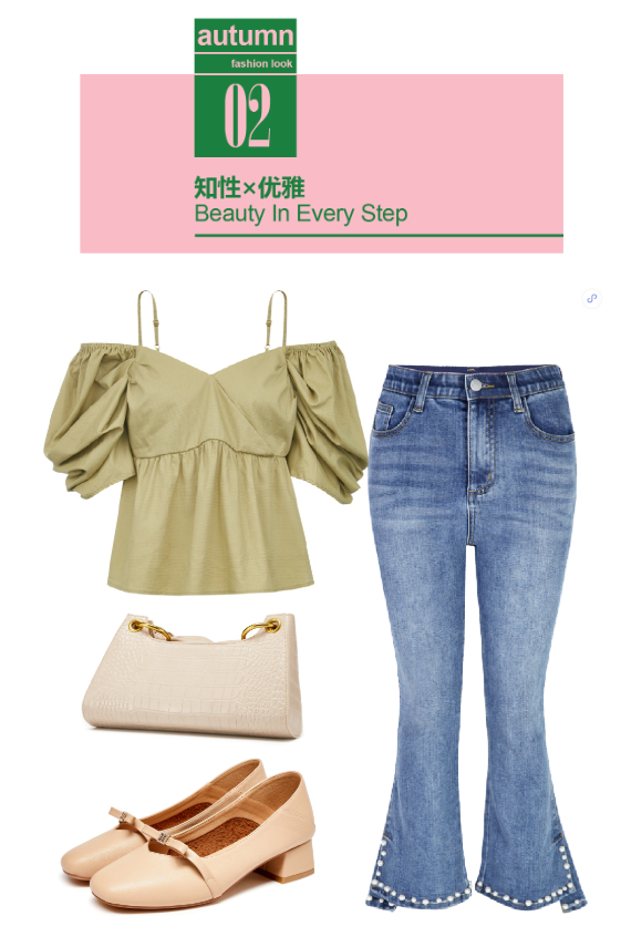 吊带+露肩比单纯的一字肩更好穿,泡泡袖稳稳藏住手臂上的拜拜肉,配上一条不规则开衩牛仔裤和裸色玛丽珍,就能美美地凑出九宫格。
