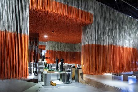 该店的设计同样充斥着工业美感,大面积运用水泥、哈哈镜和混凝土元素等堆砌而成,更引人注目的是由上万条品牌标志性的红白色浸染橡胶鞋带打造而成的“巨型帘幕”,不仅注入了品牌的灵魂,也融合了SKP-S 的未来科技感室内设计。