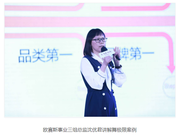 欧赛斯事业三组总监沈优君女士就舞极限项目进行了深度的案例分享,向大家介绍欧赛斯如何助力舞极限品牌通过品类创新,突破一家独大的市场封锁的全过程。