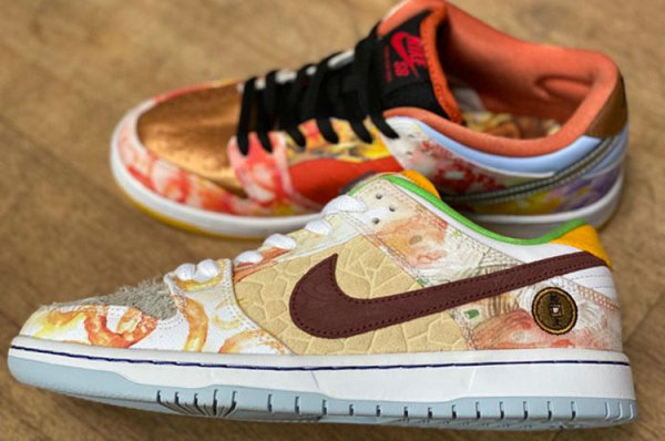 具体细节方面,左脚以浅橙/灰/棕 3 色与铜钱元素点缀,右脚则是红黄橙三色与金属质感搭配扎染设计出镜,另外后跟处的“食”字样进一步彰显中国风主题。